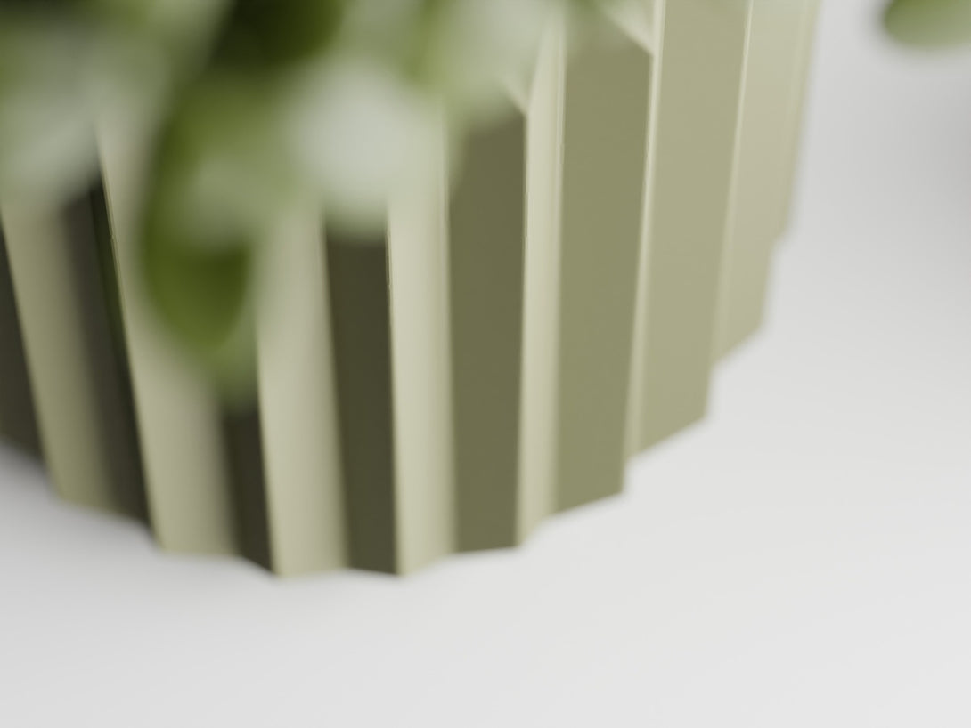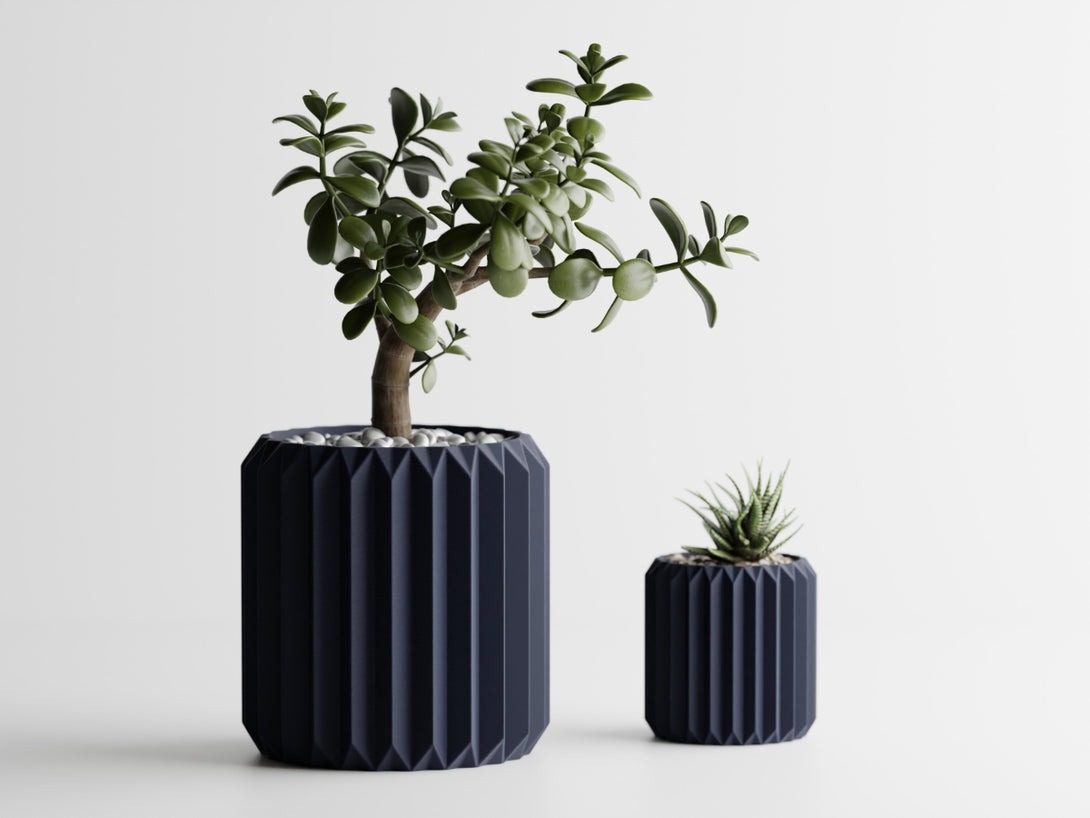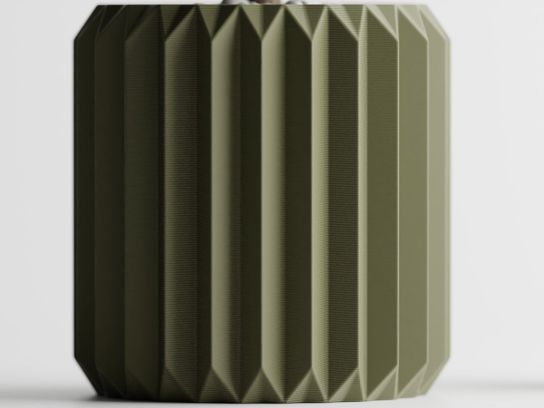直線的なフォルムと幾何学的なデザインが特徴の【折影鉢】です。シャープなリブ模様が光と影を繊細に映し出し、植物の存在感を一層引き立てます。