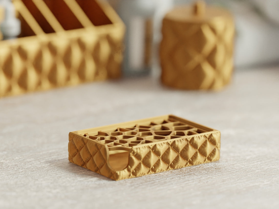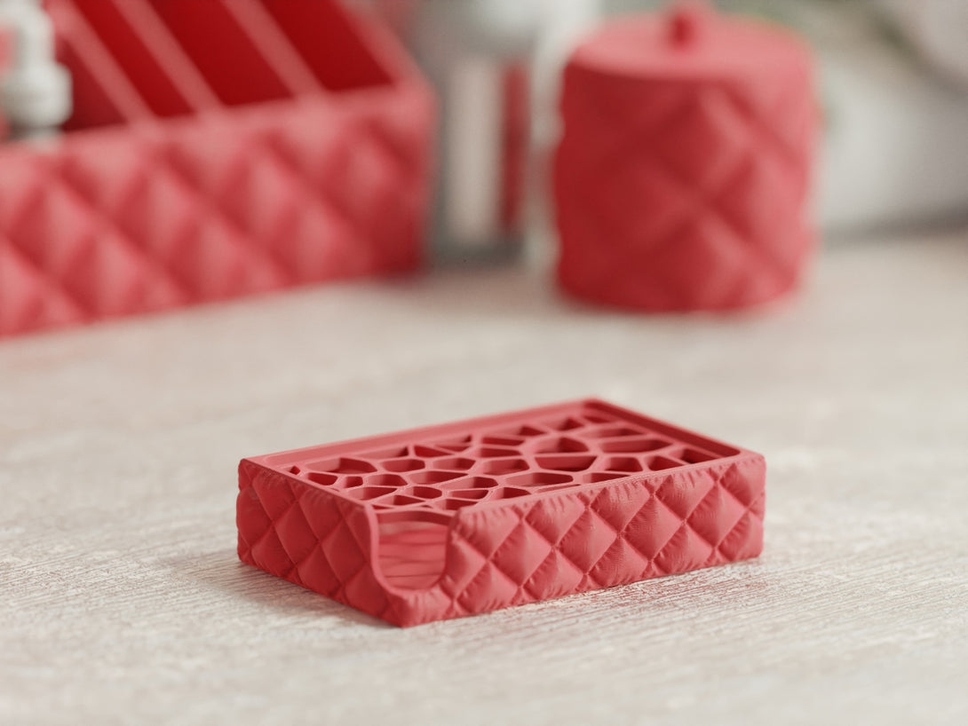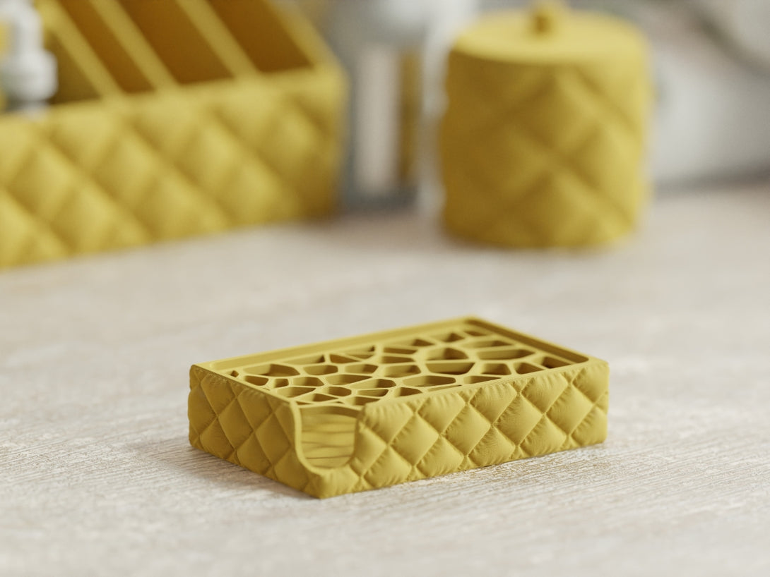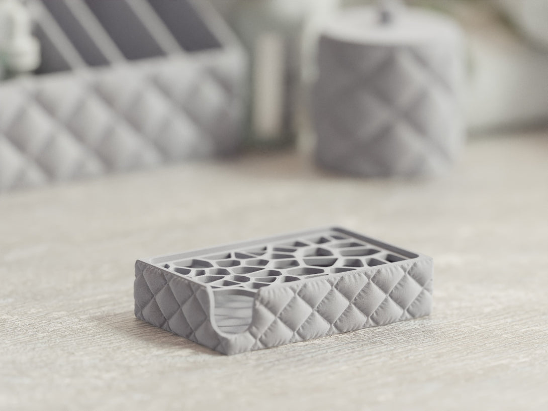 セットには、メイクアップオーガナイザーや歯ブラシスタンド、ソープディッシュなど、日常的に使用するアイテムが含まれています。
