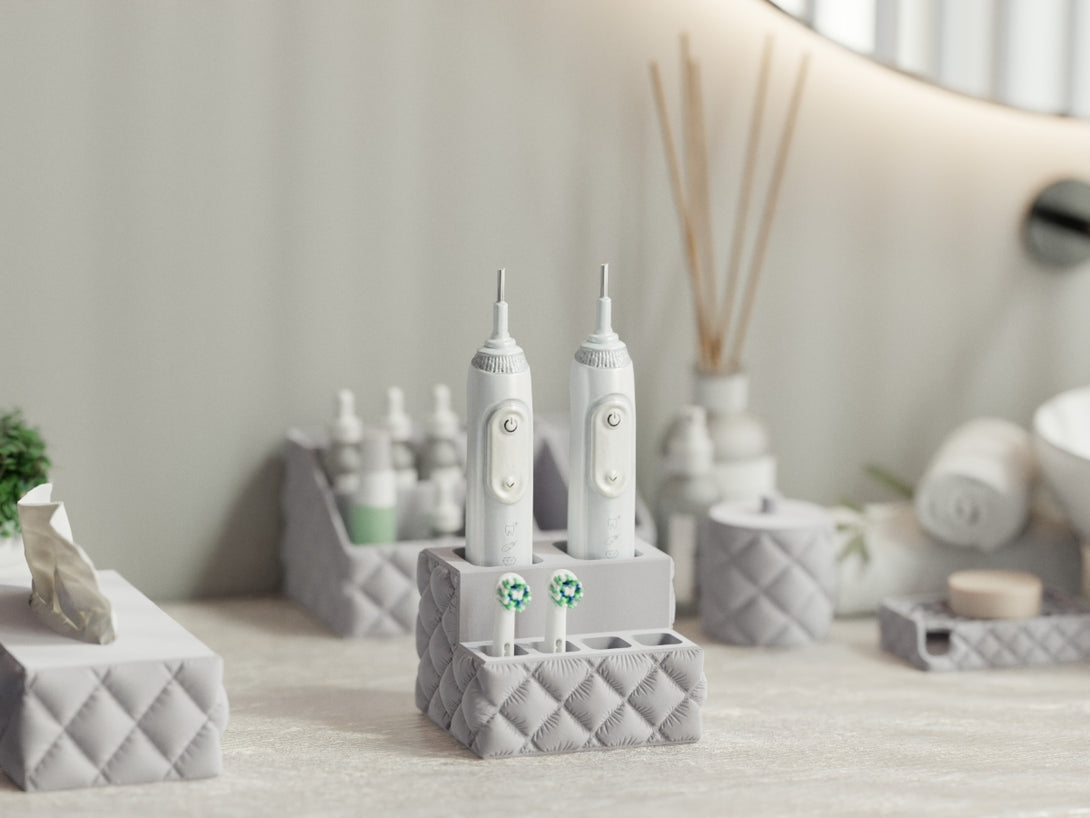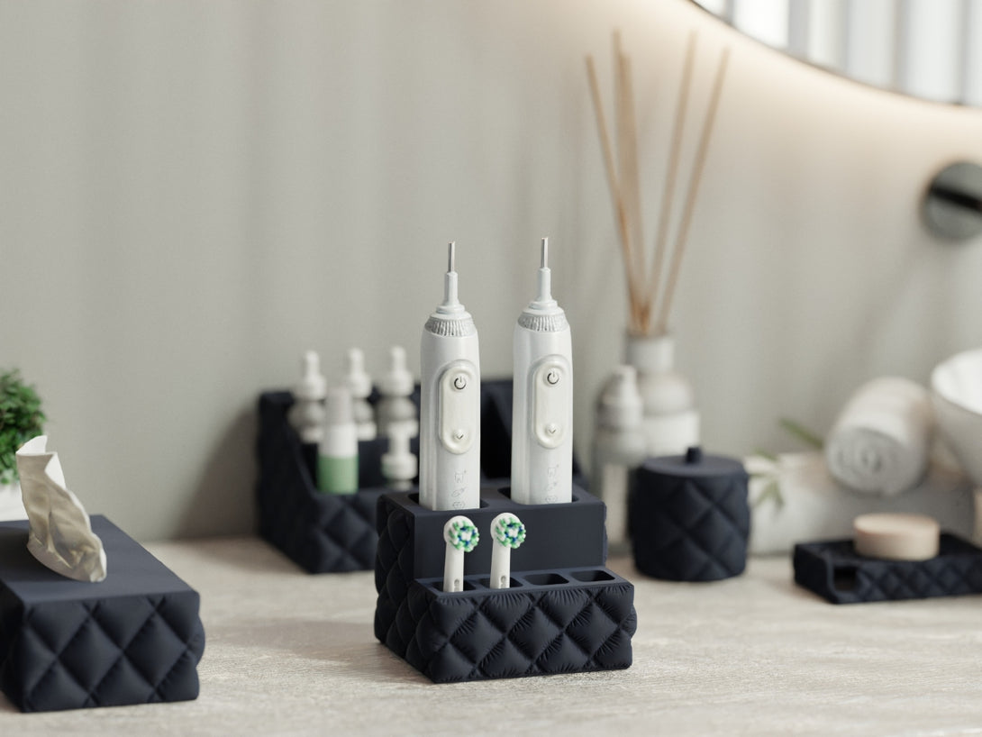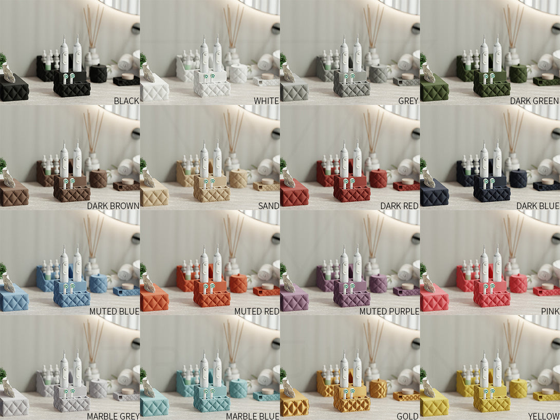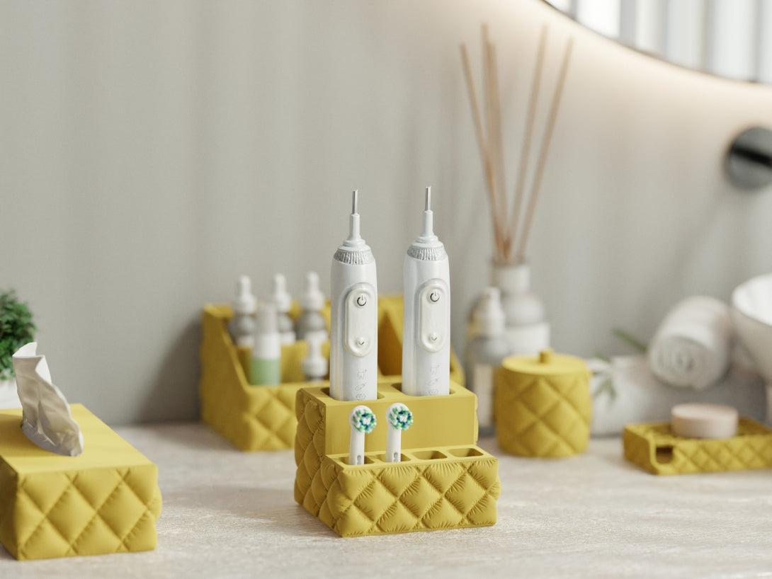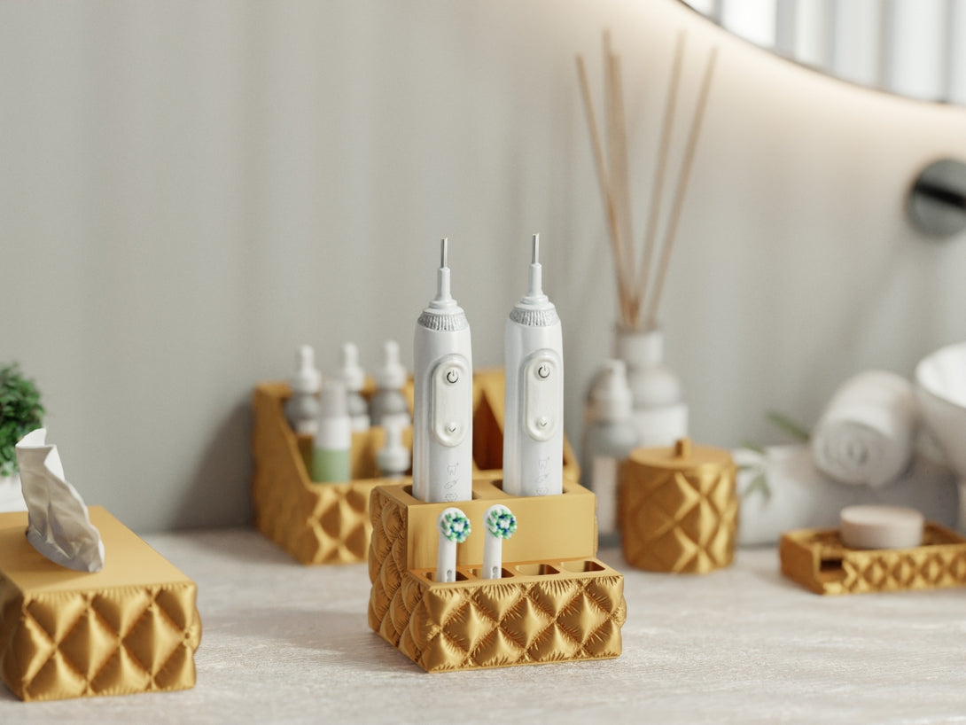 セットには、メイクアップオーガナイザーや歯ブラシスタンド、ソープディッシュなど、日常的に使用するアイテムが含まれています。