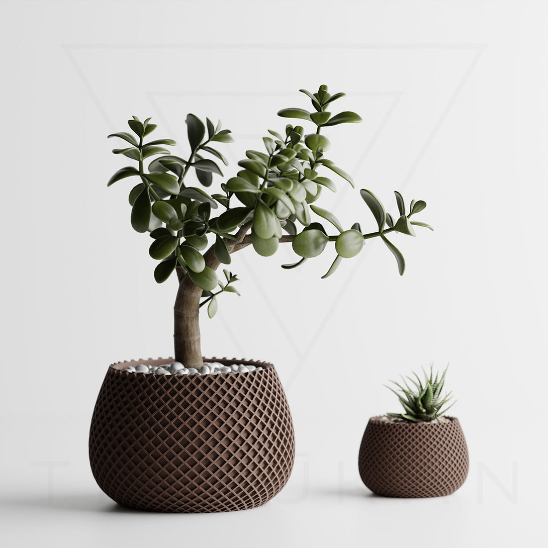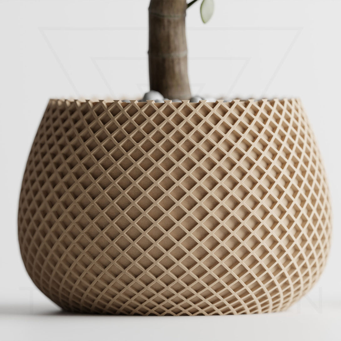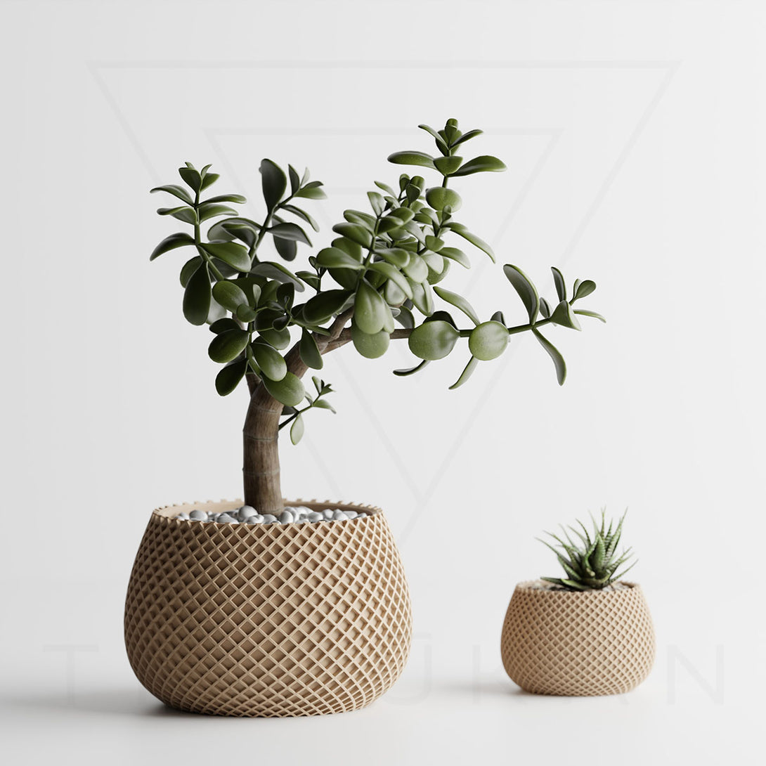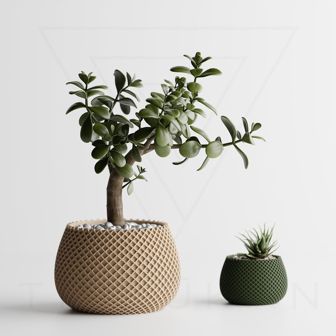 伝統的な編み模様を思わせるデザインは、クラフト感とモダンさを兼ね備え、植物の魅力を引き立てつつ空間に独自の個性を添えます。