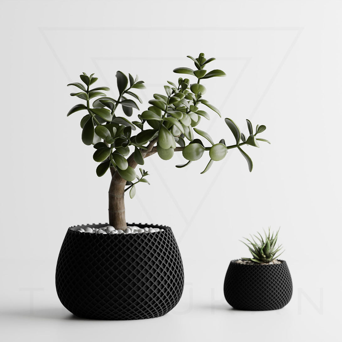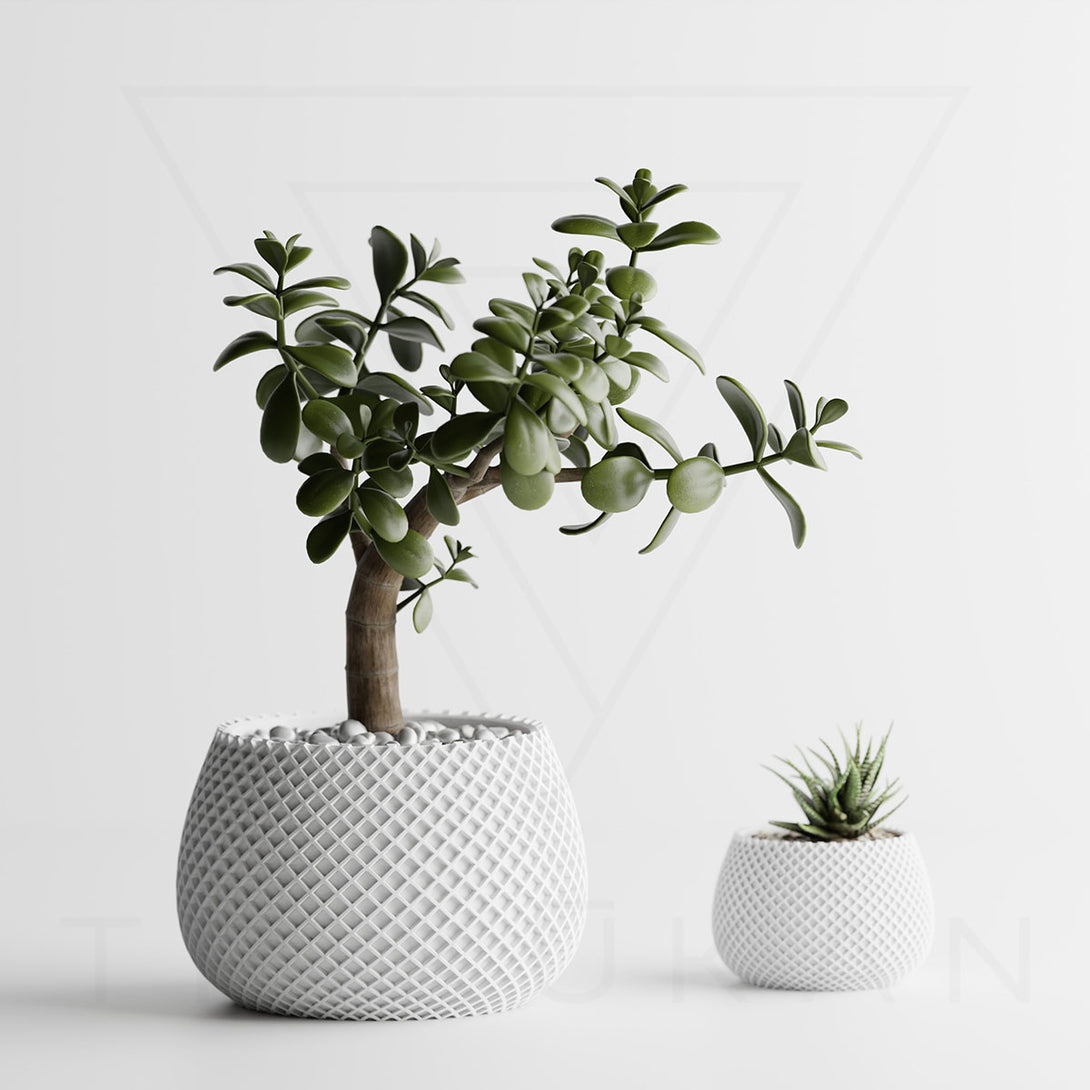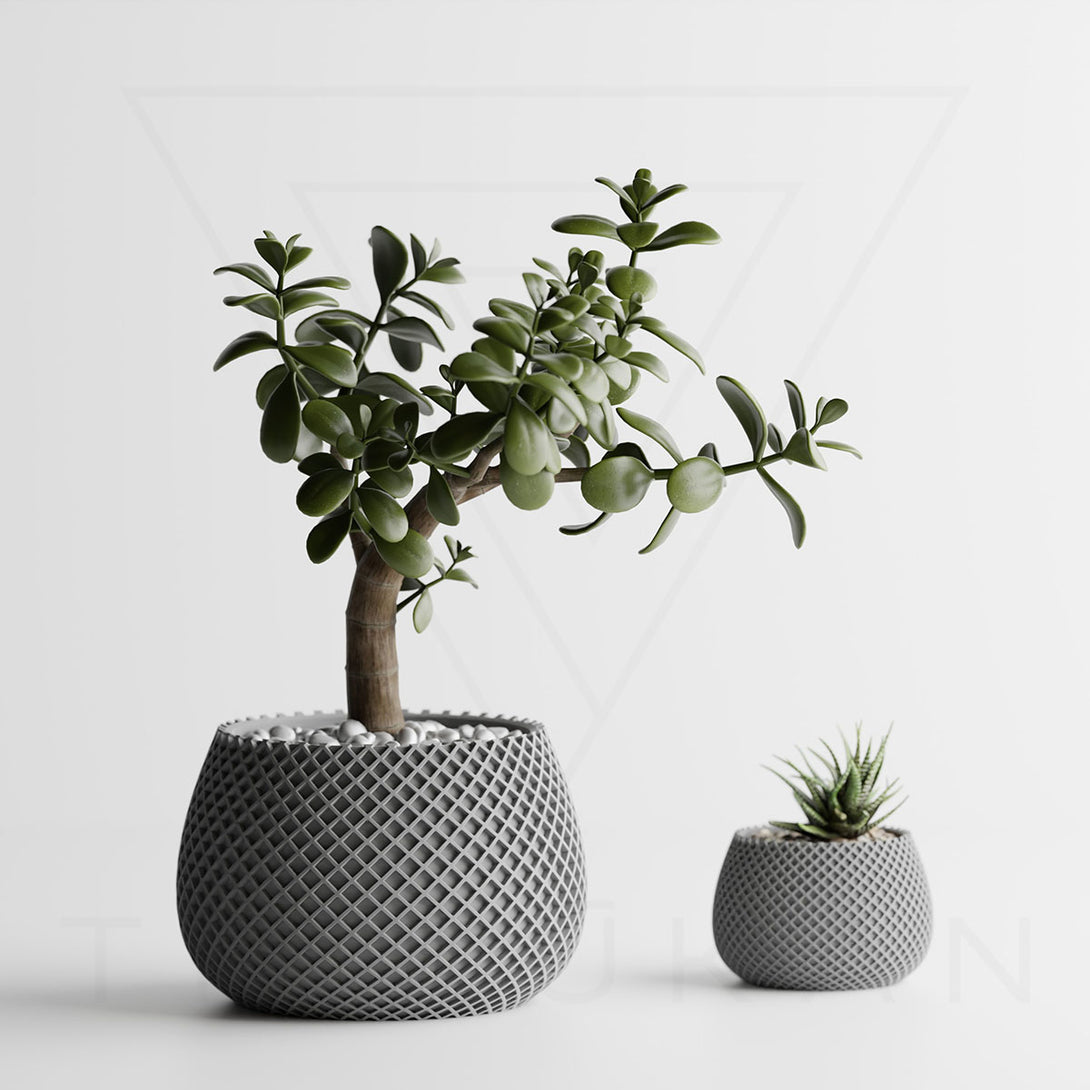 伝統的な編み模様を思わせるデザインは、クラフト感とモダンさを兼ね備え、植物の魅力を引き立てつつ空間に独自の個性を添えます。